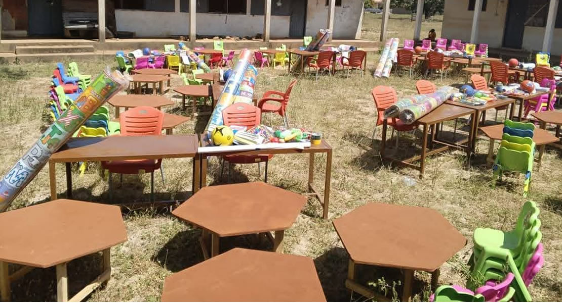 The items, which include hexagonal tables and chairs for pupils, teachers’ tables and chairs, phonics books, wall charts, talking mats, crayons, pencils, markers, scissors, glue, A4 paper, curriculum guides, footballs, and various play and teaching aids such as toy boxes, counters, shapes sets, and big books, teaching aids, storybooks, numeracy kits, and other foundational teaching and learning resources, aims to enhance the quality of early-grade education.